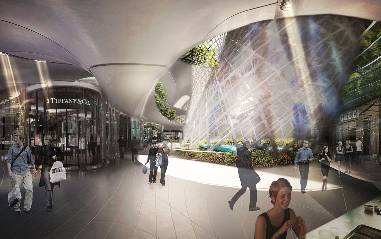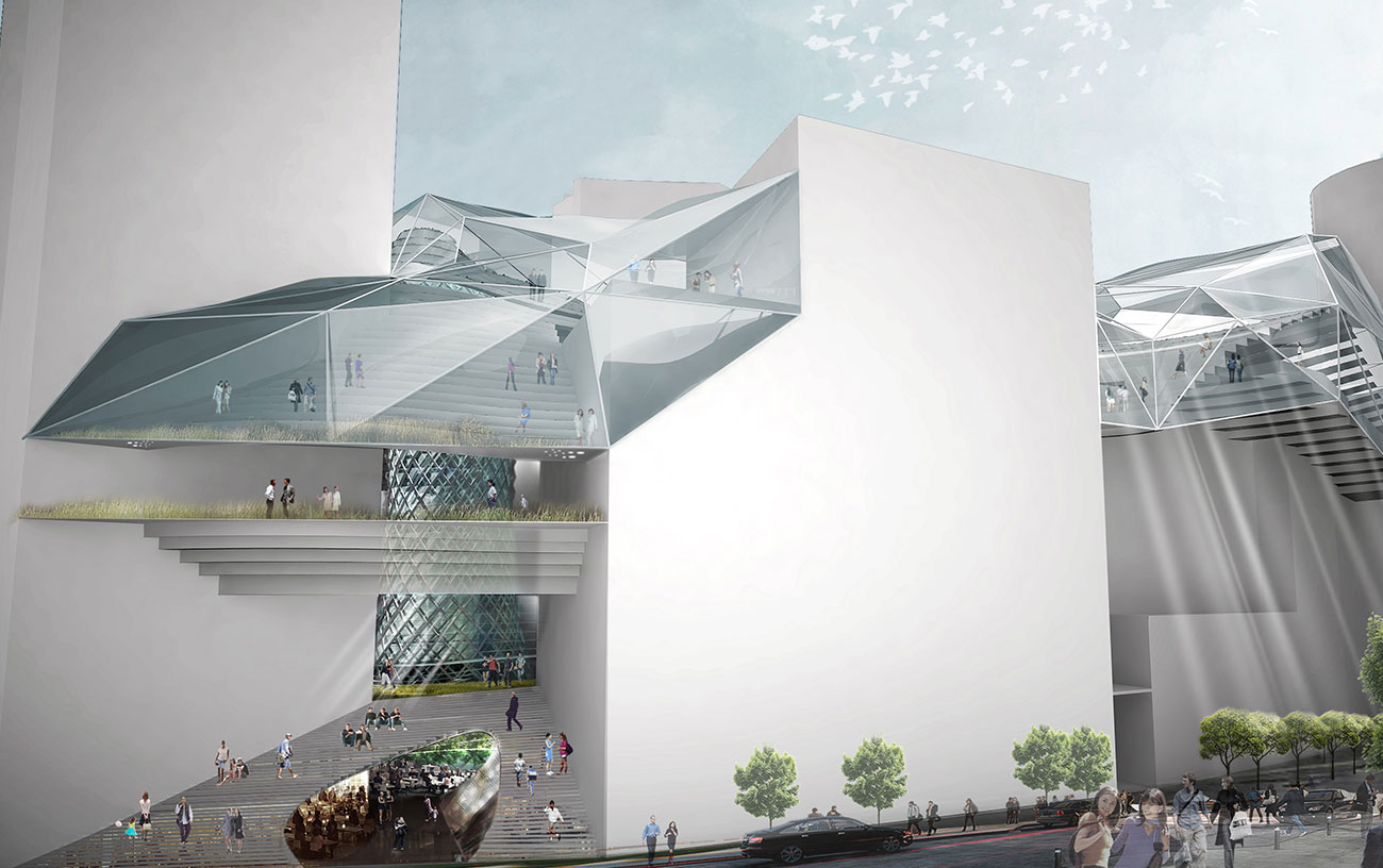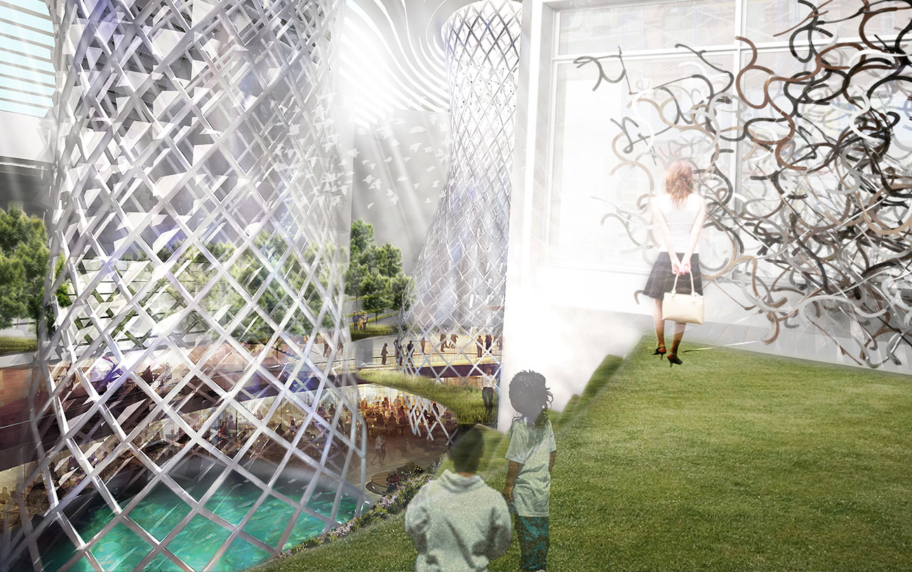 The gathering/communal spaces are stacked through the envelope of the buildings – operating as a gathering space for offices, studios, unifying element that serves the same purpose for a variety of programs. The copious use of vegetated surfaces blurs the existing building’s structure and provides more intimidate environments. The interior green scape is micro climate driven by evapotranspiration and cross breezes that reduce the airborne pollution and cools the residences while providing contemporary gardens available to residences. The ground level is extremely porous with the intention of capturing the interest of passerbyers and architects alike. The center of the space is the auditorium (a) space that can be configured to accommodate multiple size and varyingly public gatherings. The language of productive topographical surfaces is exploited for creating circulation, shading users, creating usable surfaces, storing objects, and seating. The resulting dense, carved space envelopes all the users of the building. The aim of this urban intervention is to intensify and diversify passive connectivity with the urban tissue. Creating an harmonious sustainable rhythm between buildings and public space’s social/cultural activities. The design seeks to find a new approach to respond to the issues of our current CBD’s. While we need to consolidate and centralize our cities there are many unwanted areas that seem to be inevitable. Her, I tried to find an approach based on urban Biotope (integrating nature with architecture and structure) that is based on site condition which apparently differs from site to site based on different conditions, however since the approach is based on computation and using scripting as a tool for design, there is no need to redesign from site to site and generally it is just the input that changes not the design approach. Here, the aim is to create a flux architectural product allowing for future interventions or expansions. This intervention will have the capacity to accommodate change of use and upgrade performance allowing freedom for inhabitants to shape their own space to suit their performance. A sustainable urbanization combining ecology and architecture, generating a healthy environment and adding green areas, roof top garden and a large quantities of trees and greens in public places. .